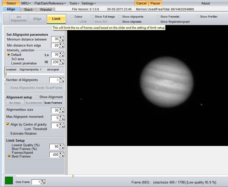 When Registax finishes aligning the frames, your best frame will be displayed and you can note down at the bottom of the window your 'Low quality %'the total amount of frames, the stacksize and the frame number of your best frame. Next click 'Limit.' You are promptly taken to the 'Stack' page.