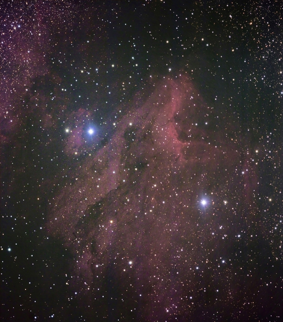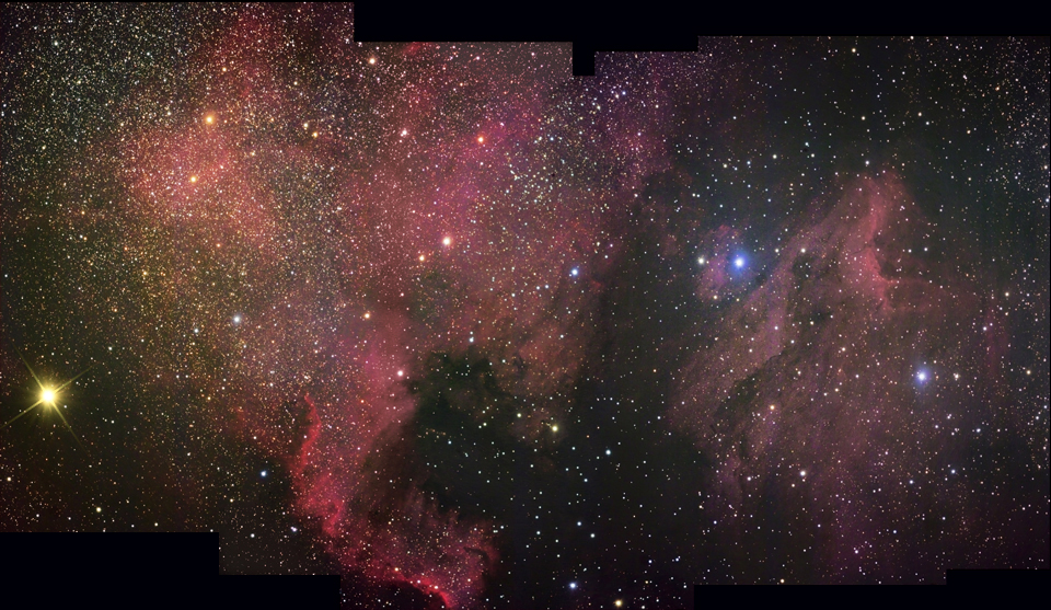 The North America Nebula (NGC 7000 or Caldwell 20) is an emission nebula in the constellation Cygnus, close to Deneb (the tail of the swan and its brightest star). The remarkable shape of the emission nebula resembles that of the continent of North America, complete with a prominent Gulf of Mexico. The Pelican Nebula (also known as IC5070 and IC5067) is an H II region associated with the North America Nebula in the constellation Cygnus. The nebula resembles a pelican in shape, hence the name. The Pelican Nebula is a large area of emission nebula in the constellation Cygnus (the Swan), close to Deneb, and divided from its brighter, larger neighbor, the North America Nebula, by a molecular cloud filled with dark dust. The Pelican is much studied because it has a particularly active mix of star formation and evolving gas clouds. The light from young energetic stars is slowly transforming cold gas to hot and causing an ionization front gradually to advance outward. Particularly dense filaments of cold gas are seen to still remain. Millions of years from now this nebula might no longer be known as the Pelican, as the balance and placement of stars and gas will leave something that appears completely different. http://en.wikipedia.org/wiki/North_America_Nebula http://en.wikipedia.org/wiki/Pelican_Nebula